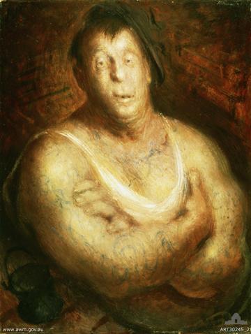 On returning to Sydney in 1939 the still relatively unknown Dobell taught at East Sydney Technical College. With the outbreak of war, he took up a position with the Civil Construction Corps, becoming an unofficial war artist. It was during this time that Dobell produced some of his most famous portraits. These include The Cypriot (1940), The Strapper (1941), and The Billy Boy (1943), the latter providing one of Dobell's most iconic references to homosexuality. The painting depicts the weighty torso of laborer Joseph Westcott, his flabby, pink flesh barely covered by a diaphanous, loose, white singlet.