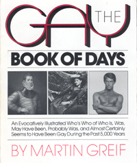 1938 – Martin Greif was born in the Bronx, New York and was an editor, publisher, writer and lecturer. (d.1996) In 1982 he published a book called The Gay Book of Days – 'An evocatively illustrated who's who of who is, was, may have been, probably was, and almost certainly seems to have been gay during the past 5,000 years'. The book was published in the UK in 1985. This history and many other blogs and sites have used it as a starting point. Martin Greif also published and edited a large number of other books, mostly through the two publishing houses he and his partner founded, Main Street Press in the US and Orchard Hill Press in Ireland. He spent his latter years with his longtime work and life partner, Lawrence Grow, in County Cork, Ireland. Larry Grow died from an AIDS-related stroke in 1991 and Martin Greif died from AIDS in 1996.