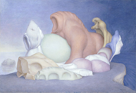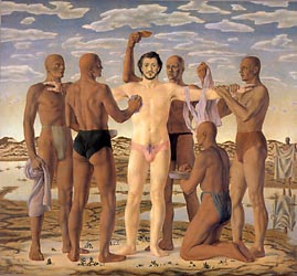 1905 – Born: American painter Jared French (d.1988) who devised a pictorial language to explore human unconsciousness and its relation to sexuality. Most of his works consist of strange, statue-like, somnambulant figures with eerily blank facial expressions positioned in austere landscapes and plazas. Rendered in a technique so precise that they seem more real than real, French's paintings capture and maintain the viewer's interest and imagination. At Amherst College in 1926, French met artist Paul Cadmus, who was briefly his lover and who became a life-long friend. After leaving Amherst, French took a job on Wall Street and then toured Europe with Cadmus between 1931 and 1933. During the 1930s and 1940s, French was a member of the Cadmus circle that included such gay literary and artistic figures as George Platt Lynes, Lincoln Kirstein, George Tooker, Glenway Westcott, and Monroe Wheeler. In 1937, French married artist Margaret Hoening, his and Cadmus's mutual friend. Cadmus did not seem upset with the marriage and the three were soon collaborating as members of the PAJAMA photographic group (the name of which was comprised of the first two letters of each of their given names). The photographs taken by French, Hoening, and Cadmus are particularly important for documenting the gay and artistic community coalescing at Fire Island in the period from 1937 to 1945. ![]() (Click for larger) French's paintings reveal the central role sexuality plays in the artist's conception of humanity. In the tempera painting entitled Washing the White Blood from Daniel Boone (1939), American Indians symbolically wash away Boone's European ancestry to make him part of the collective unconscious. Boone's metamorphosis includes a sexual awakening. Surrounded by incredibly muscular, nearly nude male Indians, he stands in the middle of the canvas, arms outstretched, wearing obtrusively feminine underwear: tight, light pink hip-huggers laced up the center with a dark blue ribbon. This scenario suggests that the painting is an exploration of Jung's concept of man's repressed feminine aspect. ![]() Nest During the 1960s, French radically altered his imagery. He began drawing fantastic biomorphic creatures that, on closer inspection, are fragments of human torsos, heads, pelvises, and genitalia emerge. French made paintings out of only a few of these arresting drawings. In one such work, entitled Nest (1968-1969), a mass of fleshy, cartilaginous forms appears to mutate atop a seaside cliff. Somewhat horrifically, this hermaphroditic creature, made up of orifices, buttocks, faces, and spines, seems to have impregnated itself and is hatching its egg on a nest of flesh and bone. In the latter part of his career, French fell out of favor with art critics and art collectors. At the end of his life, he was living in Rome, virtually in seclusion.