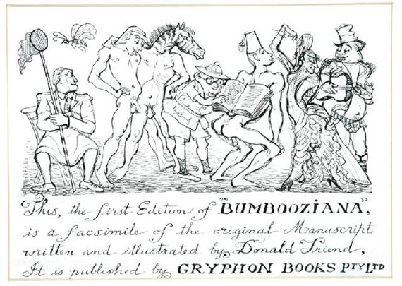 In 1979, Richard Griffin published Friend's salacious book Bumbooziana, an "investigation into the private habits of elephants, camels, zebras, leopards, etc. and the equally strange customs of men. . . ." Perhaps the most famous of Friend's publications, Bumbooziana generated much sensation when introduced to a prudish Australian public because of its erotic imagery and sexually-explicit nature, its cover page illustrating the sexualized bodies of half-human, half-zebra creations of Friend's wild imagination.