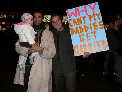 2009 – As part of Freedom To Marry Day, hundreds of Gay couples were turned away from New York City Hall this morning when they arrived to demand marriage certificates. The same-sex couples seeking to wed were part of a nationwide protest aimed at recent decisions restricting the right to marry to a man and a woman. Wearing signs that said "Just Not Married," the activists were part of a wave of demonstrations expected throughout the day at marriage bureaus or county clerks' offices from New York City to California, in communities large and small. Matt Flanders, 37, of Brooklyn, participated with his 29-year-old partner, Will Jennings. Both wore gold engagement rings. When he was denied a marriage license, Flanders said he told officials: "'I should be able to marry the person I love.' And they said, `We can only offer you a domestic partnership.'" Micah Stanek, 23, stood outside in a floor-length wedding veil after he and his partner were rejected. He said he moved to New York from San Francisco after Gay marriage was outlawed in California on the November ballot. "New York is especially important because the rest of the country follows what happens here," he said. Outside the bureau, protesters sang "Love and Marriage" and chanted, "What do we want? Marriage! When do we want it? Now!" One man held a sign that read: "Love your husband? Let me love mine!"