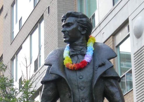 Wood was born in Fetteresso, Scotland, and he moved to Upper Canada in 1793, settling in the town of York (now Toronto) four years later. Going into business with William Allan, he established himself as one of the city's leading merchants, was gazetted lieutenant in the York militia in 1798, and was appointed a city magistrate in 1800. In 1801, Wood opened his own store providing quality goods from London and Glasgow. In 1810, Wood found himself at the centre of a scandal when he investigated a rape case. The victim, referred to as "Miss Bailey", came to Wood claiming that she did not know the identity of her attacker, however she had scratched her assailant's penis during the assault. In order to identify the assailant, Wood personally inspected the genitals of a number of suspects for injury. Several contradictory rumours existed about Wood's conduct during these inspections. As a result, he faced sodomy charges and rumours stirred of his sexual identity. It was even alleged that Wood fabricated the rape charge as an opportunity to fondle and seduce young men. To this day, the truth of what actually happened is unknown. When confronted with the charges by his friend, Judge William Dummer Powell, Wood wrote back, "I have laid myself open to ridicule & malevolence, which I know not how to meet; that the thing will be made the subject of mirth and a handle to my enemies for a sneer I have every reason to expect." Wood became the subject of ridicule and was tagged with the nickname "Molly Wood", "Molly" then being a derisive slang expression for a homosexual man. The undeveloped piece of land he owned that is now part of the Gay Village was called “Molly Wood’s Bush.” John Beverley Robinson called Wood the "Inspector General of private Accounts." Judge Powell buried the potential sodomy charges on condition that Wood leave Upper Canada. Wood left for Scotland in October 1810. Wood returned to York by 1812, resuming his prior appointment as a magistrate. He fought in the War of 1812 and was on the boards of several organizations. His life in York continued without incident until 1823, when Rev. John Strachan, a longtime friend of Wood's, recommended him for a position on the 1812 War Claims Commission. Judge Powell was the appointing authority and refused Wood on moral grounds due to the 1810 scandal. Wood sued Powell for defamation and won, but Powell refused to pay and subsequently published a pamphlet attacking Wood even further. Wood remained in York, continuing his service in civic duties for the next seventeen years. In 1827 he purchased 50 acres of land at Yonge and Carlton Streets, which was referred to as "Molly Wood's Bush" throughout the 19th century. Alexander Wood finally returned to Scotland in 1842 and he died there two years later at the age of 72. The British Colonist paid tribute to Wood as one of Toronto's most distinguished founding citizens. The area once known as Molly Wood's Bush is now part of Toronto's Church and Wellesley gay village and contains an Alexander Street, a Wood Street and an Alexander Place. In 1994, playwrights John Wimbs and Christopher Richards launched a play entitled Molly Wood, based on Wood's life. This production garnered Dora Awards for Best New Play and Best Production in 1995. In 2005, the Church and Wellesley business association erected a statue of Wood in the neighbourhood, honouring him as a forefather of Toronto's modern gay community. The statue by sculptor Del Newbigging was unveiled on May 28, 2005. Now there are moves to remove it because of vague connections to the resdiential school system. In an open letter posted on social media on June 8, states that Alexander Wood was the treasurer and a founding board member of the Society for Converting and Civilizing the Indians and Propagating the Gospel Among Destitute Settlers in Upper Canada. Wood was the society’s treasurer for at least seven years in the 1830s. It goes on to note the society financed “Indian Mission Schools,” particularly the St. John’s Mission in Sault Ste. Marie, which the letter calls a “a clear path” to the Shingwauk Indian Residential School, operated by the Anglican Church and Canadian government from 1873 to 1970. (Note that Wood died 30 years before the latter school opened! Another case of "jump on the hysteria bandwagon!") On April 4th 2022, the statue was quietly removed at the order of the local merchant society, who had erected it.