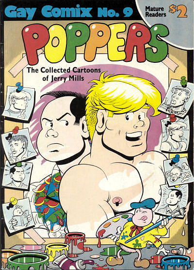 1951Jerry Mills (d.1993) was a gay cartoonist, noted particularly for his creation of the "Poppers" comic strip. The strip told of the adventures of Billy, a West Hollywood muscleboy, and his sidekick Yves (based on Mills), a big-hearted nebbish who offered good advice and caution (usually unheeded) for his glamorous friend. Yves always went along for the ride with Billy, commenting on the action, a function he took over from a witty crab louse that lived on Billy's pubic hair, when it was phased out after the first few strips.
